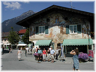 Vor einem Haus mit Lüftlmalerei in Garmisch